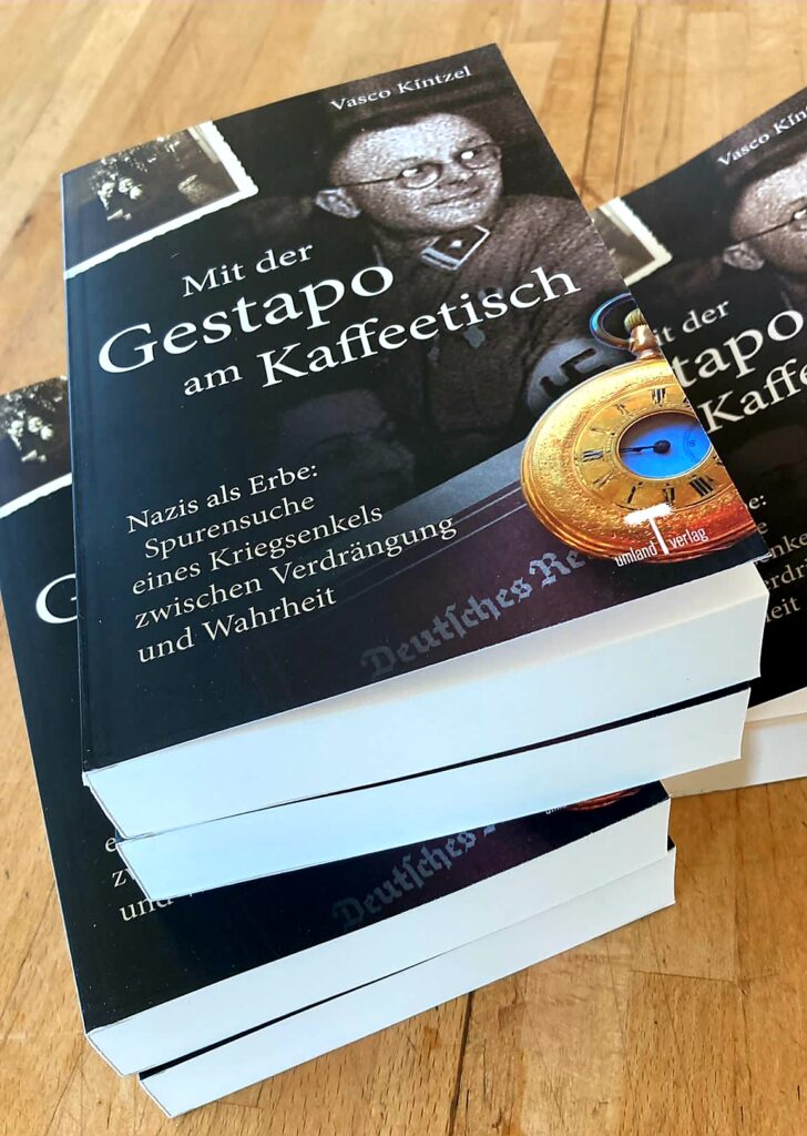 Auf die Beteiligung an diesem Buch bin ich besonders stolz! Im Februar 2026 ist „Mit der Gestapo am Kaffeetisch“ von Vasco Kintzel erschienen. Der Autor setzt sich darin auf besonders gründliche und mutige Weise mit der verschleierten NS-Vergangenheit seiner Familie auseinander. Die Recherche führt ihn tief in die Tagebücher der Großmutter, deutsche und polnische Archive, die Tiefe der Erinnerung und vor allem ins eigene Ich. Erschienen ist das Buch ebenfalls im UMland-Verlag. Ich durfte es lektorieren und das Nachwort beisteuern.
